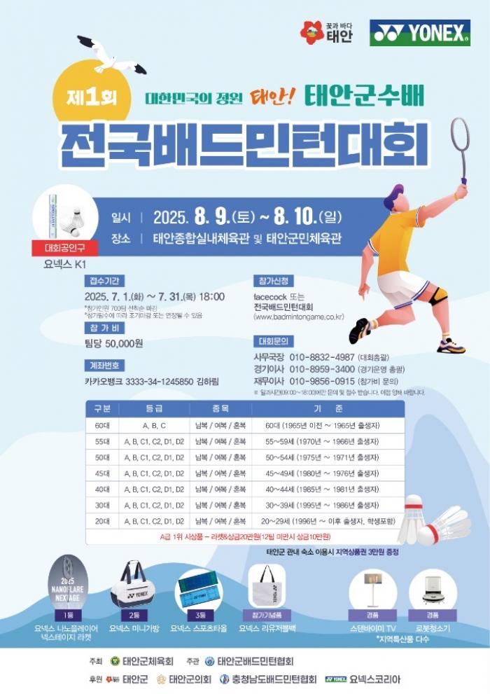 ★ 대회관련 공지 ★ - 일요일 전 경기 태안종합실내체육관에서 진행합니다 - 40, 45, 50, 55대 전 경기 : 태안종합실내체육관 - 20, 30, 60대 전 경기 : 태안군민체육관 - 토요일 08시 30분 혼복부터 경기시작 - 개회식 : 8. 9.(토) 11시(태안종합실내체육관)